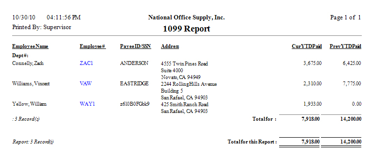 Reviewing 1099 information pertaining to independent contractors is made easy using the 1099 Report. This report shows the current and previous years' payments made to independent contractors and the contractors' payee IDs or social security numbers. This report is most useful in reviewing 1099 information prior to printing 1099 forms.