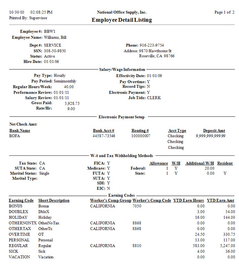 The Employee Detail Listing displays the most information about each employee and independent contractor. Information shown on this report includes personal data, salary/wage details, electronic payment setting, W-4 and tax withholding methods, accumulated earnings per earning code and associated worker's comp groups/codes, leave benefits and deductions for the current tax year, and dependents. If you need to glance quickly a variety of employee/independent contractor information in one report rather than review multiple reports in order to save time and effort, the Employee Detail Listing perfectly serves your purpose. This report is also useful if you want to verify the employees' names and addresses prior to printing W-2s but you do not want to print information on their salaries/wages.