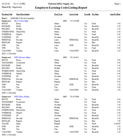 Employee Earning Code Listing