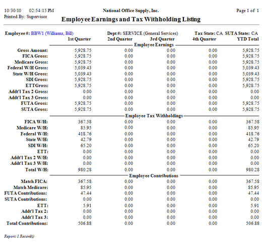 One of the most vital employee reports is the Employee Earnings and Tax Withholdings Listing. This report lists each employee's quarterly and year-to-date gross earnings, withheld taxes, and contributions for the current tax year. If an individual earns or pays taxes in multiple states, the report separately shows information for each state. This report helps you review and compare on a quarterly basis the employees' earnings, tax withholdings, and contributions. Use this report and the Employee W-4 Listing to help you verify the accuracy of the system-calculated earnings, tax withholdings, and contributions.