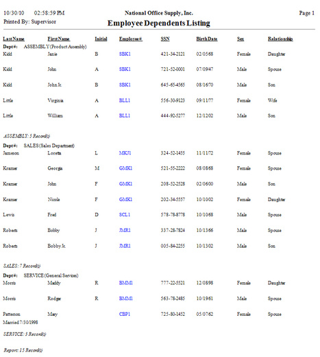 The Employee Dependents Listing shows the complete names, social security numbers, birth dates, and gender of the dependents claimed by each employee on his/her federal and state tax returns. This report also shows each dependent's relationship with the employee. Use this report to verify the validity of the dependents claimed by each employee and to reconcile the number of dependents against the claimed allowances specified in the employee record.
