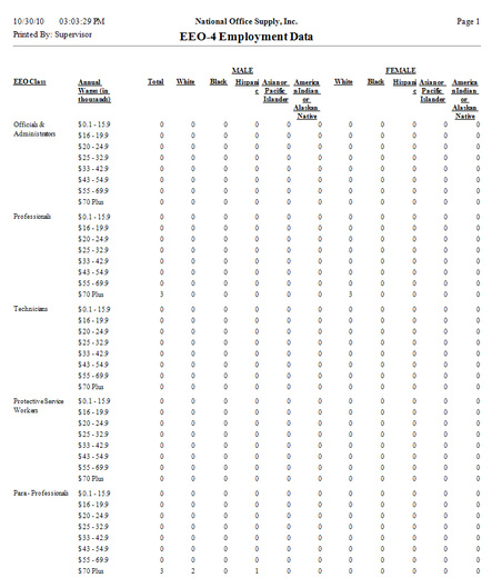 If you need equal employment opportunity data for the entire company, generate the EEO-1 Employment Data report (a.k.a. Employer Information Report). This report displays the number of employees assigned with a certain EEO class and ethnic code. You can use this report together with the EEO Report to review the statistics of the employees' EEO classes and/or ethnic codes. This report is available if the EEO Reporting State/Local Government checkbox is unmarked in PR Module Setup's General (2) tab.