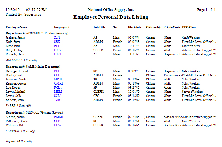 There are instances when you need to quickly view an employee's personal information such as the assigned department, job title, gender, birth date, citizenship, ethnic code, and EEO (Equal Employment Opportunity) class. In those instances, the Employee Personal Data Listing is what you need.