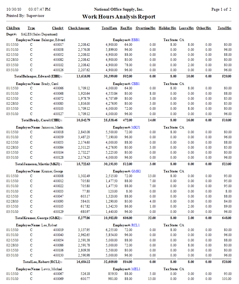 employee and the relative pay check amount and total earnings. This report
