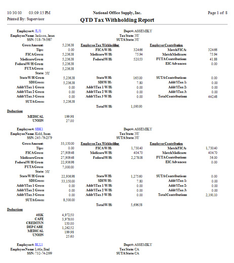 To determine the total taxes withheld from each employee's earnings and the company's total tax contribution for each quarter of either the current or prior tax year, generate the QTD Tax Withholdings Report. If an employee has earnings or tax withholdings in multiple states, the employee's earnings and taxes will be shown separately for each state. This report is most useful as reference in verifying the accuracy of the quarterly tax returns. Keep copies of this report for audit purposes.