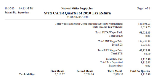 If you are looking for a report that you can use as reference for preparing the payroll quarterly tax returns for a particular tax state, generate the State Quarterly Return. This report shows, for each type of tax applicable to the selected state, the gross taxable wages and the state tax amount. It also shows the total state tax liability for the month and quarter as well as the deposited amount of state taxes and the balance due.
