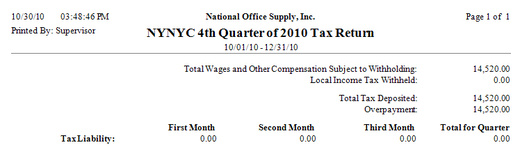 The Local Quarterly Return provides information required to fill in the quarter-to-date payroll tax return for a particular local tax jurisdiction. This report shows the gross taxable wages, local tax amount, total local tax liability for each month and quarter, deposited amount of local taxes, and balance due. This report is most helpful in preparing the quarterly payroll tax return for local taxes.