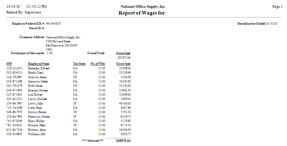 If you are looking for a report to help you verify the employees' earnings and tax withholdings in a particular quarter of the current tax year, you need the Report of Wages. This report is most useful when you prepare quarterly payroll tax returns and when you print the report of wages for California on DE6 Forms. For audit purposes, it is strongly recommended for you to print this report prior to performing W-2/1099 Year-End closing for the current tax year.