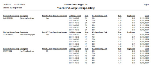 A variety of information on the worker's compensation groups set up in AccountMate is available in the Worker's Comp Group Listing. It displays for each worker's compensation group the GL Account ID to which AccountMate posts the accumulated liability and the states for which you are setting up the worker's compensation codes assigned to the group. The report also displays for each worker compensation code the associated premium rate for every $100-worth of qualified wages, the experience factor by which the worker's compensation premium is adjusted upon meeting or exceeding a certain threshold, and the maximum amount of liability that can be accumulated in a given tax year. This report serves as a quick reference for the worker's compensation group records.