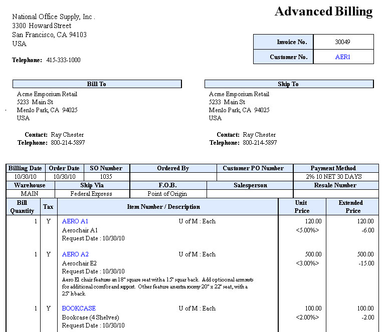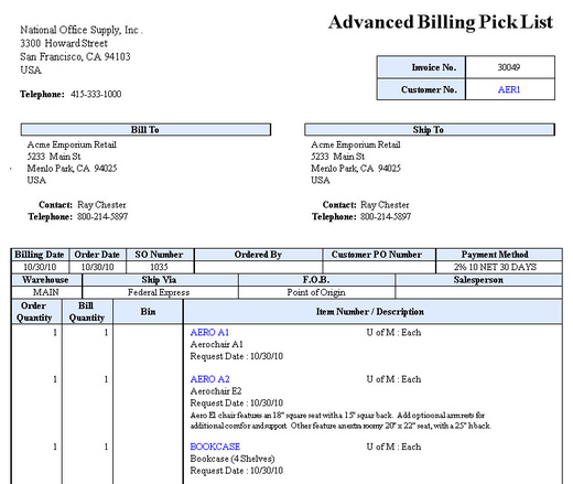 An advanced billing is a document that you send to your customers to acknowledge the sale and to collect payment prior to the shipment of the ordered goods. The Advanced Billing Reports allow you to print advanced billing and advanced billing pick list documents as well as other reports that provide summary and detailed information on advanced billings.