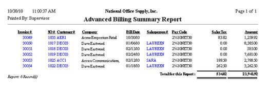The Advanced Billing Summary Report provides summary information on advanced billings including the invoice and sales order numbers, bill dates, customer numbers and company names, salesperson numbers, pay codes, advanced billing amounts and applicable sales taxes. This report is useful for monitoring the advanced billings for the unshipped sales orders and for reviewing which sales orders were already billed in advance.