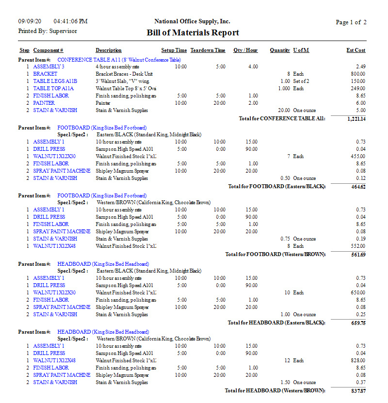 The Bill of Materials Report provides information about the components that may be inventory items, labor resources, or machine resources needed for manufacturing the master and/or parent items. A parent item is a subassembly, which has its own components as specified in its own bill of materials record (BOM) and which you manufacture for use in the master item production. These pieces of information are set up in the Bill of Materials Maintenance function. This report is handy in reviewing the components used in the manufacture of the master and/or parent items. You have the option to show in the report the manufacturing instructions for each parent item. You can also configure AccountMate to roll up all costs from the subassemblies into their parent items. You can choose to include in the report only the inventory components, only the labor components, only the machine components, or all components. You can elect to display in the report the inventory components standard costs only, average costs only, or either the standard costs (if these are non-zero) or average costs. Lastly, the report provides the options to include in the report only the BOM current version or all the BOM versions set up for each inventory item. ![]() |