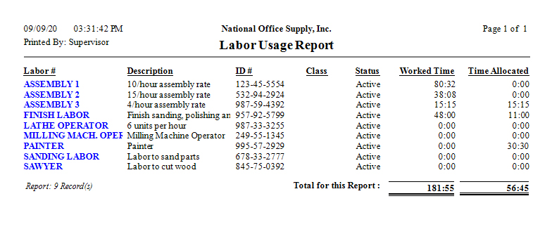 The Labor Reports provide information about the labor components particularly the list of labor setup and teardown time as well as the labor usage details. Each of the Labor Reports has various options and criteria that provide a wide variety of labor component-related information and report formats. Read the information below to get a closer look at each of the Labor Reports available in AccountMate. Labor Setup and Teardown Listing The Labor Setup and Teardown Listing provides information on the default labor setup and teardown times, units processed per hour, and the associated costs for each labor resource, all of which are taken from the labor records. This report lists the labor component numbers and descriptions, ID numbers, classes, status, production rates, production costs, setup time and costs as well as teardown time and costs. You can use this report in analyzing the costs and other relevant information pertaining to the various labor resources used during the manufacturing process. It also serves as a guide in reviewing the accuracy of details in the labor records. You can opt to include in the report only the active labor resources, only the inactive labor resources, or all labor resources regardless of their status. ![]() Labor Usage Report The Labor Usage Report provides information on the usage of labor resources. This report lists the labor component numbers and descriptions, ID numbers, classes, status, worked time, and allocated time for each labor resource used during the manufacturing process. You can refer to this report when determining the worked time and allocated time for labor resources and when analyzing the usage of various labor resources. You may include in the report only the active labor resources, only the inactive labor resources, or all labor resources regardless of their status. ![]() |
