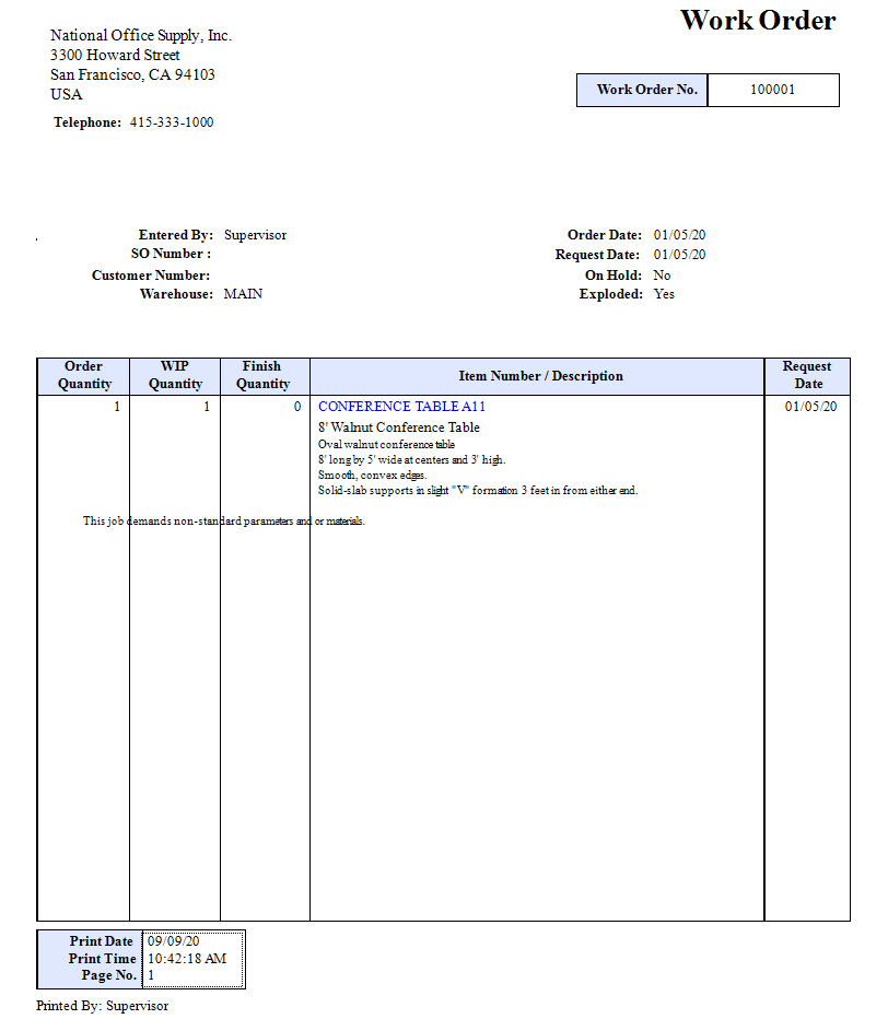 The Print Work Order function allows you to preview and print a work order that identifies the inventory items to manufacture, including relevant information about the request date, order quantity, work-in-process, and finished quantities. Needless to say, the Production Department can refer to the Work Order document to determine the inventory item quantities that will be manufactured, are still in the process of being manufactured, and had been manufactured. You can configure AccountMate to print for an alignment test only and to suppress the report labels' background color. You can also choose to print all the previously printed work orders, all the work orders that are yet to be printed, or all work orders regardless of their printing status. You can print the work orders either on pre-printed forms or on a plain paper. You can print multiple copies of the work orders with user-defined labels. You can set up these parameters in the MI Module Setup > Printing tab. ![]() |