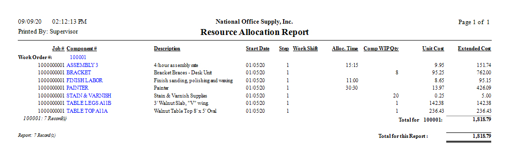 ![]() Resource Allocation Report The Resource Allocation Report provides information about inventory, labor, and machine components that are allocated or reserved for the jobs that are posted to work-in-process. Specifically, this report displays the work order numbers, job numbers, component numbers and descriptions, start dates, manufacturing step numbers, work shifts, allocated time, component work-in-process quantities, unit costs, and extended costs pertaining to the components that have been allocated for the jobs in process. This report can be used as reference in identifying the cost of each component in each job that is in process. It can also help you determine the components' work-in-process quantities and the allocated time of machine and labor resources. You can choose to include in the report only the inventory components, only the machine components, only the labor components, or all components regardless of their types.