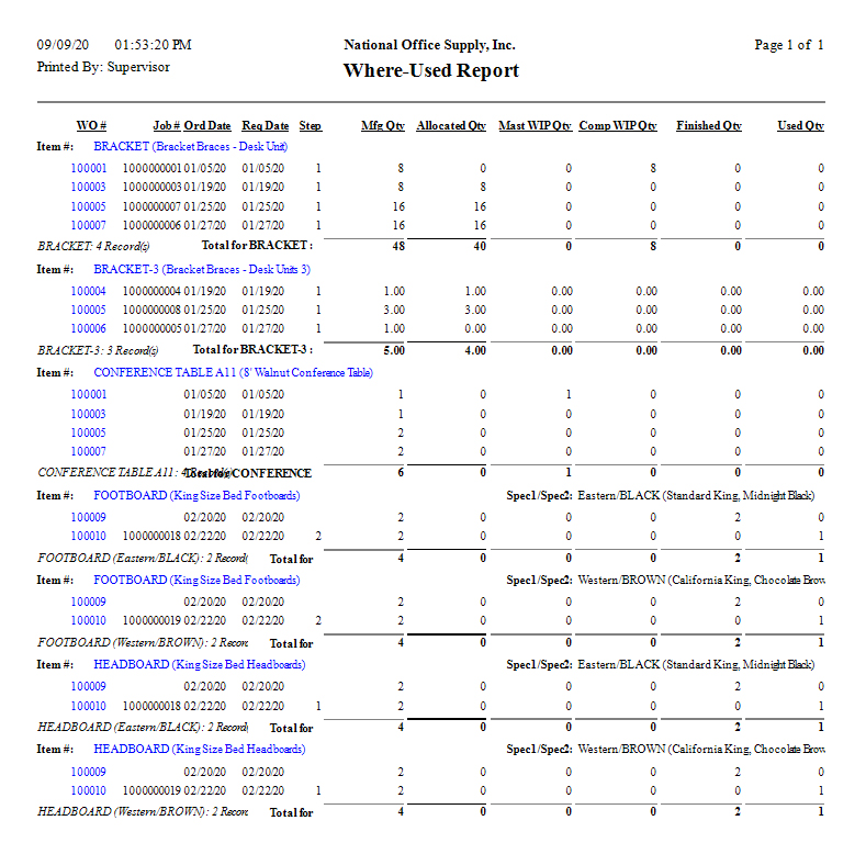 The Where-Used Report provides information on the usage of the master item components--inventory items, labor resources and/or machine resources--to complete a job. This report lists for each component the related work orders and jobs to which the component is required. In addition, the report shows the quantities needed to manufacture a master or parent item as well as the work-in-process, allocated, finished, and used quantities of each component in every job. The report shows for each labor or machine resource the setup time, teardown time, manufacturing time, allocated time, and the time used for each component in every job. You can refer to this report when monitoring the resources usage during production.