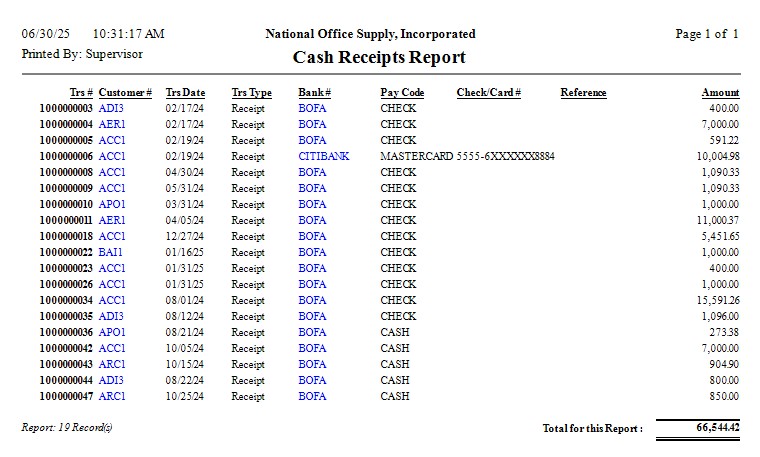 ![]() Cash Receipts Report The Cash Receipts Report provides information on customer payments. This report is useful for reviewing customer payment details and for comparing the cash receipts against the bank deposits. You can generate this report according to pay types--cash only, check only, credit card only,