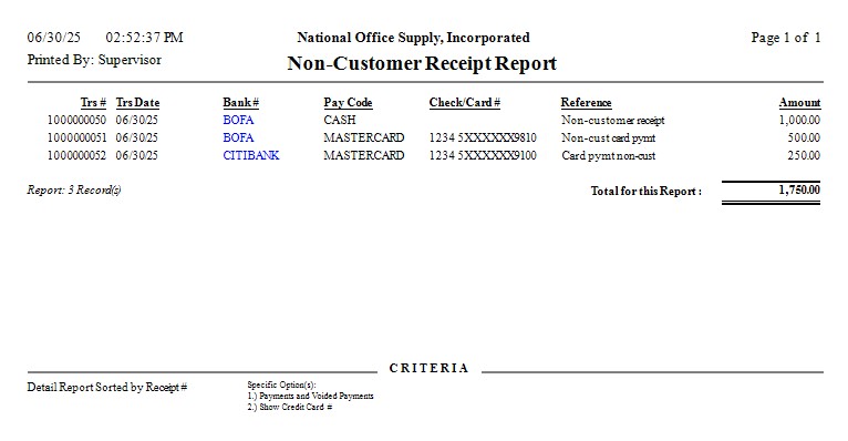 ![]() Non-Customer Receipt Report The Non-Customer Receipt Report provides information on payments from non-customers. This report is useful for reviewing non-customer payment details and for comparing the cash receipts against the bank deposits. You can select to generate this report for non-voided payments only, voided payments only, or all
