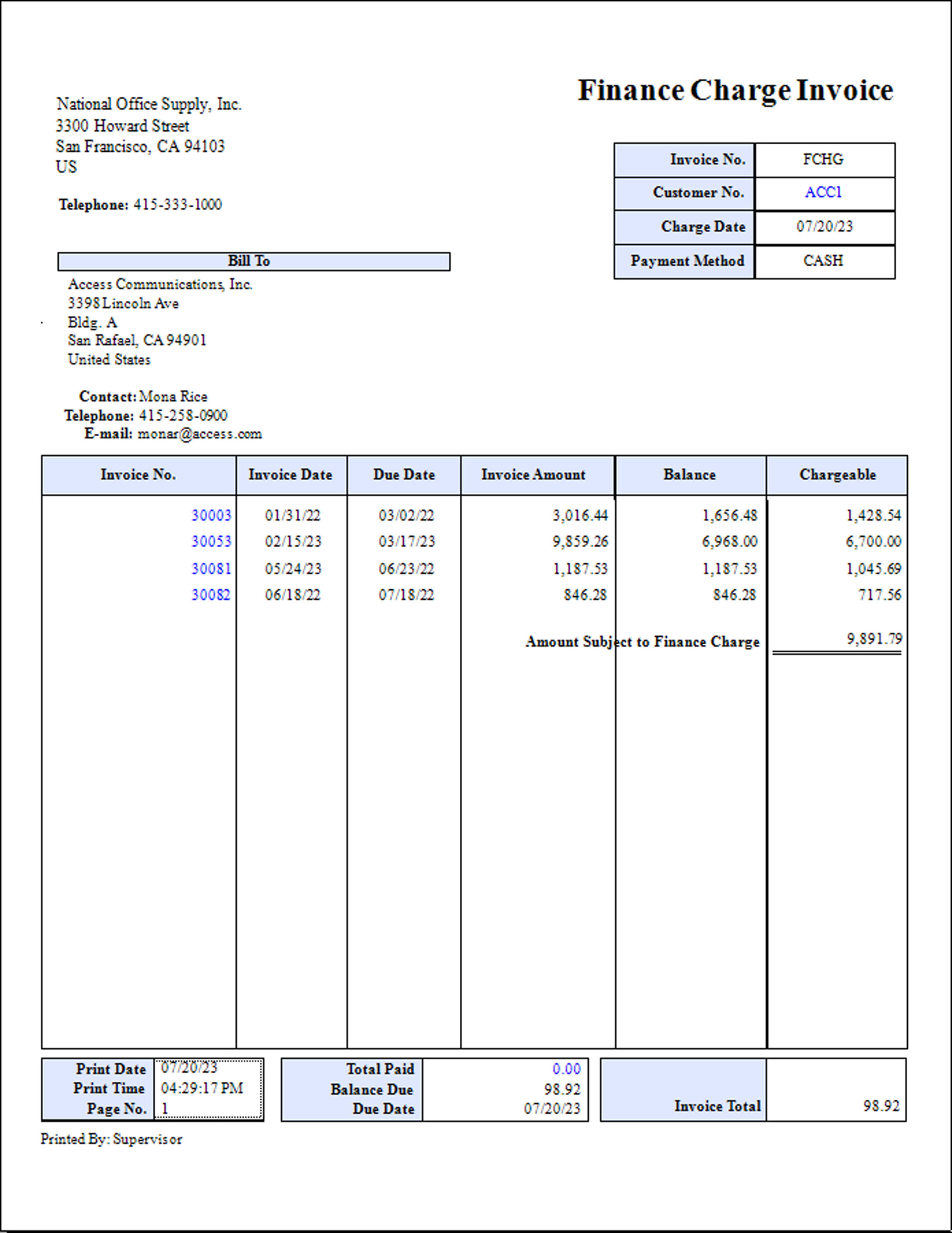 The Finance Charge Report provides information on finance charges and finance charge adjustments applied to past due invoices. This report helps you determine the amount of finance charges applied to each overdue invoice and the amount of finance charge adjustments made, if there are any. You can select to include in this report finance charges only, finance charge