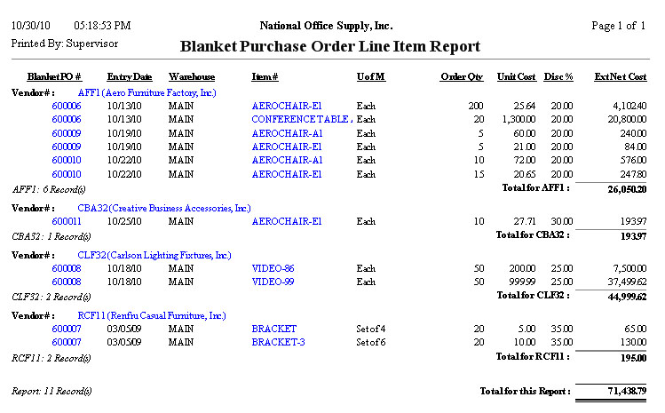 The Released Blanket Purchase Order Report provides information on the line item quantities that are released from blanket purchase orders. This report provides details on the unit cost, the discount taken advantage of, and the extended cost of the line item quantities released from blanket purchase orders, among other information. This report is useful for reviewing the quantities released from blanket purchase orders and for cross-referencing the blanket purchase orders with the purchase orders generated upon the release of quantities. You may include in the report the freight charge and sales tax information. You
