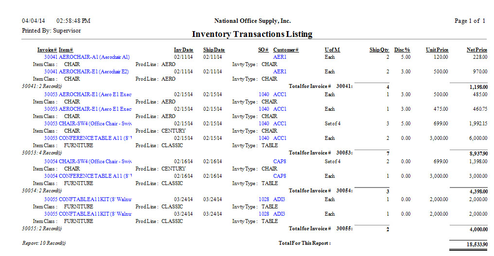The Inventory Transactions Listing shows the details of inventory item transactions that are recorded in the Sales Order or Accounts Receivable module. This report lists all the inventory item transactions within a specific date range based on the entry date and/or invoice date. This report is useful for monitoring, reviewing and analyzing sales of the inventory items. You can select to generate this report only for shipments with invoices, only