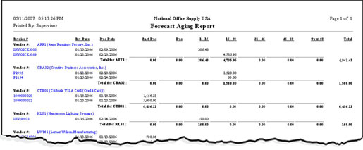 The Forecast Aging Report provides information on the outstanding invoices as of a given future date and helps you determine cash requirements to pay off the outstanding payables. This report also displays the invoices' age bracket.