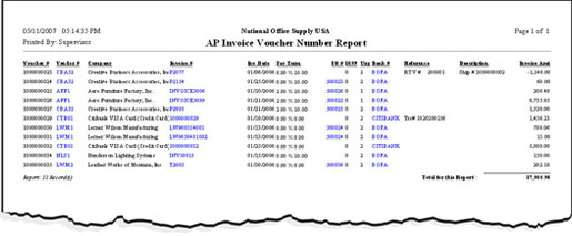 The AP Invoice Voucher # Report shows all voucher numbers that are automatically generated upon posting of an invoice, except for voided and purged invoices. This report can be used as a reference to counter check internal control through voucher numbers.