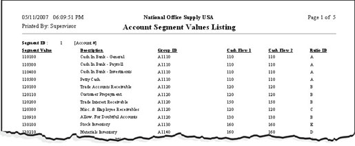 The Account Segment Values Listing provides information on the account segment values set up for each account segment type. It lists the account segment types and values as well as each account segment value's assigned group ID, cash flow categories, and ratio group. This report is useful for reviewing the correctness of the account segment values and determining the propriety of the cash flow category and ratio group assigned to each segment value.