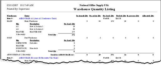 The Warehouse Quantity Listing provides information on inventory item quantities in each of the warehouses that your company has maintained. This report is useful for determining which inventory items are stored in each warehouse, among other details. You can use this report in managing the inventory items, particularly in determining each inventory item's current volume level, availability, and movement within a specific warehouse.
