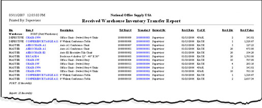 The Inventory Transfer Reports provide various information involving transfers of inventory items-moving inventory items between bins within a warehouse, transferring to and receiving in a warehouse, and items in-transit. These reports are presented in various report formats to allow you to generate specific data concerning the physical location and movements of the inventory items in specific warehouses.
