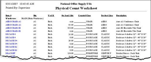 The Physical Count Worksheet is a listing of inventory items that have been frozen in preparation for a physical count. The report shows the inventory item, its bin location, and a space for manually recording the item's quantity per count. This report is useful in facilitating the physical count and serves as a basis for updating inventory items' quantities and serial numbers after performing the count.