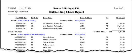 The Check Reports provides detailed information primarily on the status of checks entered into the system through the BR, PR and AP modules. Generating these reports provides a necessary audit trail; it is useful for monitoring checks status and facilitates reconciling bank accounts. Each of these reports is especially designed to provide several options so you can narrow down data to the specific information needed. Each report is also presented in various report formats.