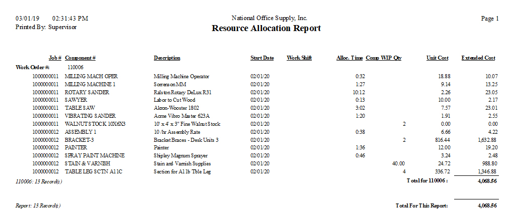 The Resource Allocation Report provides information about inventory, labor, and machine components that are allocated or reserved for the jobs that are posted to work-in-process. Specifically, this report displays the work order numbers, job numbers, component numbers and descriptions, start dates, work shifts, allocated time, component work-in-process quantities, unit costs, and extended costs pertaining to the components that have been allocated for the jobs in process. This report can be used as reference in identifying the cost of each component in each job that is in process. It can also help you determine the components' work-in-process quantities and the allocated time of machine and labor resources. You can choose to include in the report only the inventory components, only the machine components, only the labor components, or all components regardless of their types.