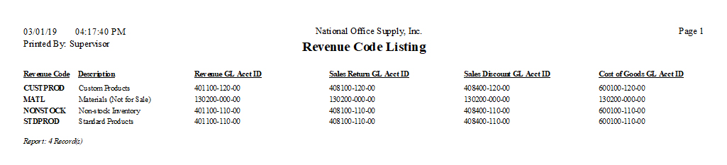 The Revenue Code Listing provides detailed information on the revenue codes including the assigned GL Account IDs for recording sales, sales returns, sales discounts, and cost of goods sold. Revenue codes are set up using the Revenue Code Maintenance function. This report is useful for reviewing the completeness of the revenue code records and for validating the GL Account IDs assigned to each revenue code.