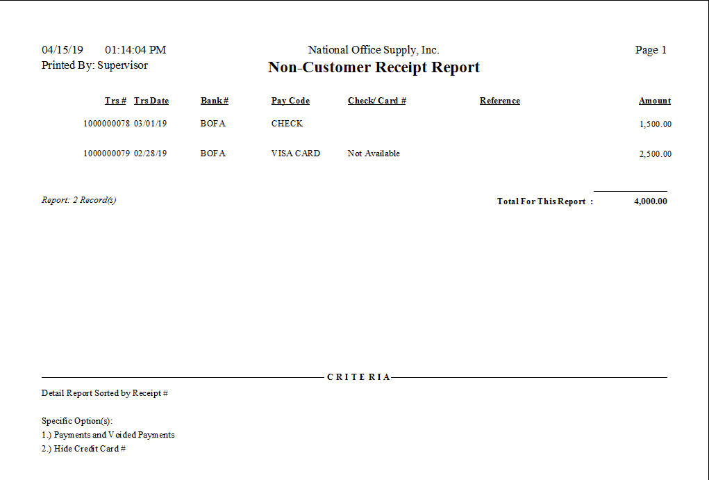 The Cash Receipts Report provides information on customer payments. This report is useful for reviewing customer payment details and for comparing the cash receipts against the bank deposits. You can generate this report according to pay types-- cash only, check only, credit card only, C.O.D. only, other types only, or a combination of these pay types. You can further select to generate this report for non-voided payments only, voided payments only or all payments regardless of whether these are voided. Available also are options to include in the report the cash/credit card refunds for open credits and to show multi-currencies. Payment Distribution Report