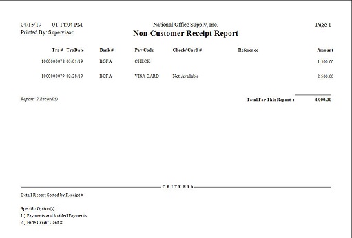 The Print Payment Receipt function allows you to generate receipts for payments collected from customers. You can print the receipt immediately after saving the apply payment transaction. You can use this report to acknowledge payments received from customers. You can choose to print for an alignment test only and to include voided payments in the document. You can filter which receipts to print based on the pay type assigned to them. You can print unprinted receipts only, previously printed receipts only, or all receipts. You can also opt to hide, encrypt or show the complete credit card information on the document. You can print a Payment Receipt either on a short or long pre-printed form or an ordinary paper. You can configure these settings in the AR Module Setup -> Printing tab. Cash Receipts Report
