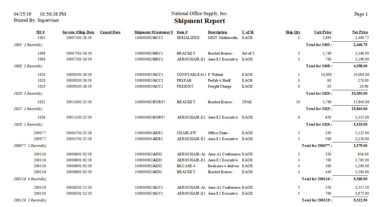 ![]() The Shipment Report provides information on sales order shipments including the sales order and customer numbers, ship dates and applicable invoice numbers as well as the shipped items' numbers, units of measurement, quantities, unit prices, and net extended prices. This report is useful for determining and analyzing the shipment activities within a specified period. You can opt to include in the report the freight charges and adjustment amounts. You can also elect to print each group of information on separate pages. There are also available options to show the shipped items’ serial numbers, lot numbers, kit numbers, as well as the shipped kit items’ formulas, if any, and the multi-currencies. You also have the option to show in the report the shipped items’ descriptions and the items’ assigned classes, product lines, and inventory types. You can further filter the report only for cancelled shipments, only for shipments with invoices, only for shipments without invoices, or for all shipments including those that were cancelled. Shipment On-Time Analysis Report