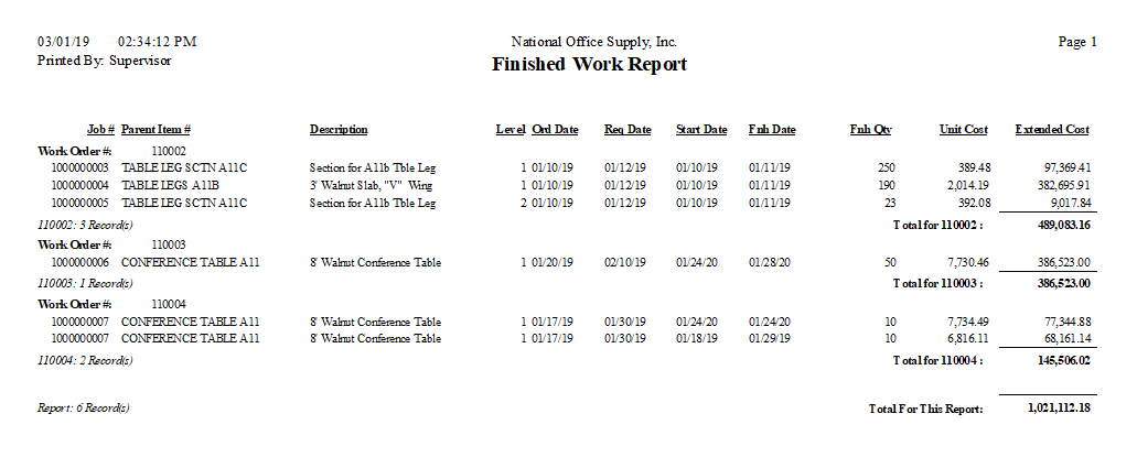 The Finished-Work Report provides information about the completed manufacturing jobs. This report displays the work order numbers, job numbers, parent item numbers and descriptions, manufacturing levels, order dates, request dates, start dates, finished dates, finished quantities, unit costs, and extended costs pertaining to the finished manufacturing jobs. This report comes in handy when you need to evaluate productivity in terms of job completion and to monitor the cost of finished jobs in each work order. You can elect to include in the report only the master parent jobs, only the subassembly jobs, or all jobs. You can further filter the information in the report by choosing to include only the completed jobs, only the incomplete jobs, or all jobs regardless of their completion status. You can also elect to include only the parent items in each work order which finished quantities are released to inventory, only the parent items in each work order which finished quantities are yet to be released to inventory, or all parent items in each work order regardless of whether the finished quantities are released to inventory.