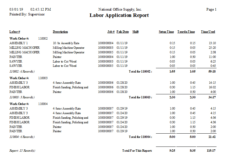 The Labor Application Report provides information about the labor resources used to complete a job. This report displays specific information including the work order numbers, labor component numbers and descriptions, job numbers, finished dates, work shifts, setup time, teardown time, and time used pertaining to the labor resources used to complete a job. This report is useful in identifying the labor time used to complete a job. It also serves as reference in updating the inventory item's bill of materials record.