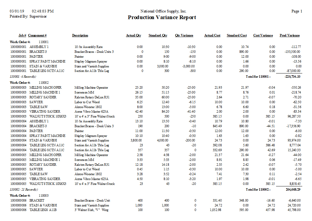 The Production Variance Report provides information on the completely finished jobs and the variance between the expected and actual raw material quantities, labor time, and machine time used to complete a job. This report displays specific information including the work order numbers, job numbers, component numbers and descriptions, actual quantities and costs, standard quantities and costs, quantity and cost variances, and production variances pertaining to completed jobs. You can use this report as reference in evaluating production efficiency and performance and in planning the use of resources in future manufacturing jobs.