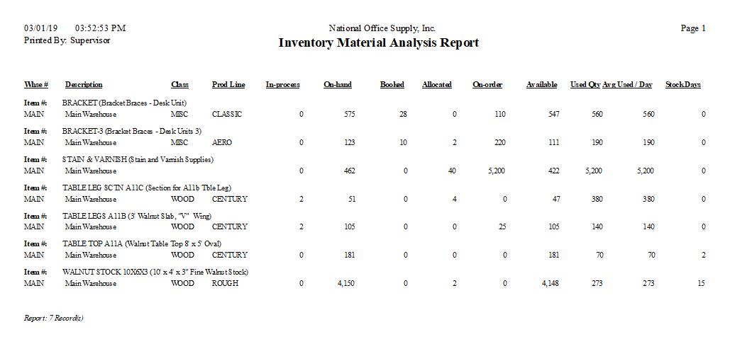 Click image to enlarge/reduce view Inventory Material Analysis Report