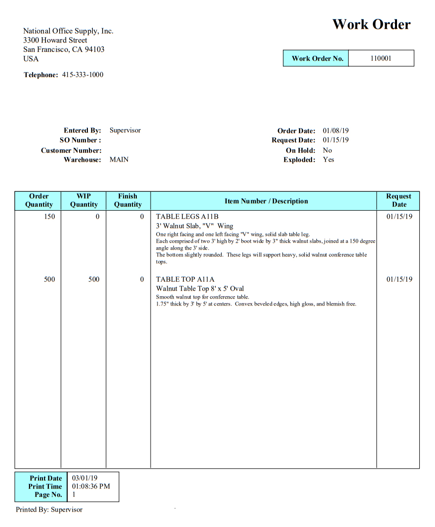The Print Work Order function allows you to preview and print a work order that identifies the inventory items to manufacture, including relevant information about the request date, order quantity, work-in-process, and finished quantities. Needless to say, the Production Department can refer to the Work Order document to determine the inventory item quantities that will be manufactured, are still in the process of being manufactured, and had been manufactured. You can configure AccountMate to print for an alignment test only. You can also choose to print all the previously printed work orders, all the work orders that are yet to be printed, or all work orders regardless of their printing status. You can print the work orders either on pre-printed forms or on a plain paper. You can set up these parameters in the MI Module Setup > Printing tab.