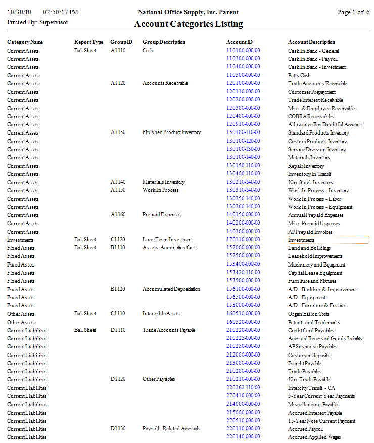 The Accounts reports provide detailed information on the GL Account ID balances in a given period and the changes in the GL Account ID balance between periods as well as the listing of account categories, account groups and account segment values. These reports help you in reviewing the trend of the company's operations by analyzing the changes in the GL Account ID balances. These reports also help you in assessing the propriety of each GL Account ID's category.