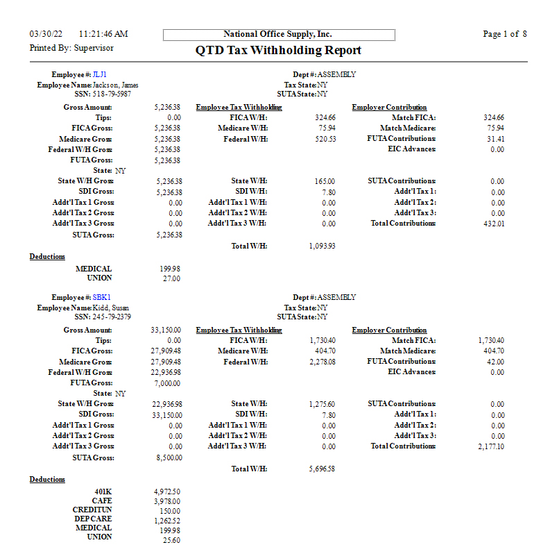 To determine the total taxes withheld from each employee's earnings and the company's total tax contribution for each quarter of a specific tax year, generate the QTD Tax Withholdings Report. If an employee has earnings or tax withholdings in multiple states, the employee's earnings and taxes will be shown separately for each state. This report is most useful as reference in verifying the accuracy of the quarterly tax reports. Keep copies of this report for audit purposes. You can choose which quarter of a specific tax year for which you want to print the report for. This report also provides an option to exclude information for those employees with zero quarter-to-date gross amounts (FICA gross, Medicare gross, Federal Withholding gross, etc).