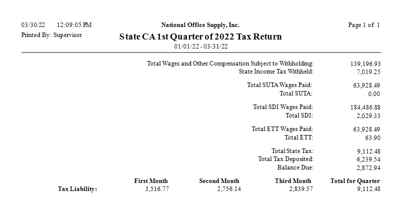 If you are looking for a report that you can use as reference for preparing the payroll quarterly tax reports for a particular tax state, generate the State Quarterly Report. This report shows, for each type of tax applicable to the selected state, the gross taxable wages and the state tax amount. It also shows the total state tax liability for the month and quarter as well as the deposited amount of state taxes and the balance due. You can choose the particular tax state and the quarter of a specific tax year for which you want to print the report.
