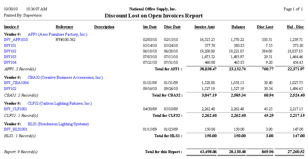 The Discount Taken Report lists all invoices for which early payment discounts are taken advantage of. This report excludes the invoice discounts to be taken in the future unless a check is printed or a handwritten check is recorded for the invoices. This report is useful in reviewing how well you are taking advantage of the early payment discounts. You can also use this report and the Discount Lost Reports to assess your overall discount-taking effectiveness. Depending upon the chosen report criteria, you can generate the report only for invoices for which discounts were taken advantage, only for invoices for which no discounts are taken advantage of, or for all invoices that are subject to discounts. You can opt to show multi-currencies in this report. Discount Lost on Paid Invoices Report