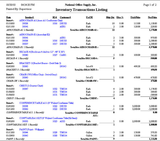 ![]() The Inventory Transactions Listing shows the details of inventory item transactions that are recorded in the Sales Order or Accounts Receivable module. This report lists all the inventory item transactions within a specific date range based on the entry date and/or invoice date. This report is useful for monitoring, reviewing and analyzing sales of the inventory items. You can select to generate this report only for shipments with invoices, only for shipments without invoices generated from the Sales Order module, or all shipments. You can also select to show in this report multi-currencies as well as the items' classes, product lines, and inventory types. |
