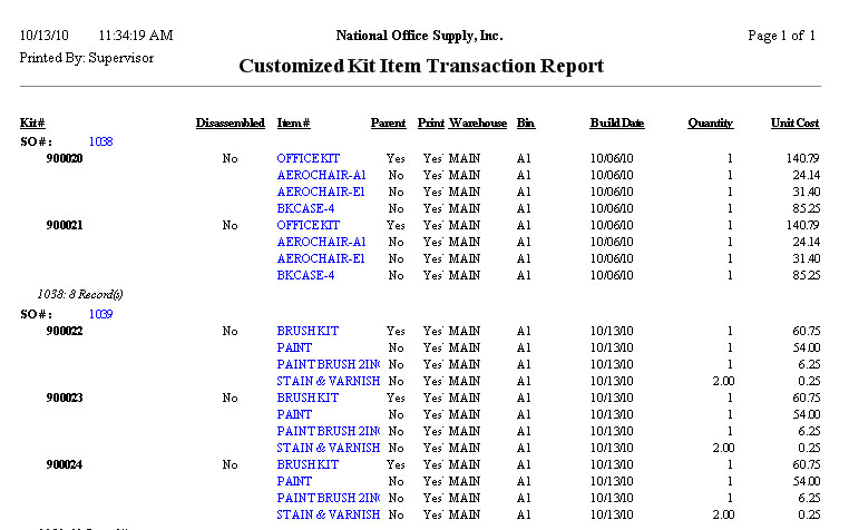 ![]() The Sales Order Line Item Report provides detailed information on each sales order or sales quote line items including the sales order numbers, customer numbers, order dates and source warehouses as well as the inventory items' numbers, units of measurement, order quantities, unit prices, discount rates, and net prices. This report is useful in reviewing the correctness of sales order or quote information and in determining the inventory items that are saleable during a specified period. You can generate this report only for sales orders or only for sales quotes. You can also opt to include in the report the sales orders on credit hold, freight charges, and sales tax amounts. You can also configure the report to show the kit formula; item description; item class, product line, and inventory type; an Upsell column that identifies whether the line item was included in the sales order as an upsell item; and show multi-currencies. You can also opt to display on a separate page each group of information based upon the chosen sorting option. Customized Kit Item Report