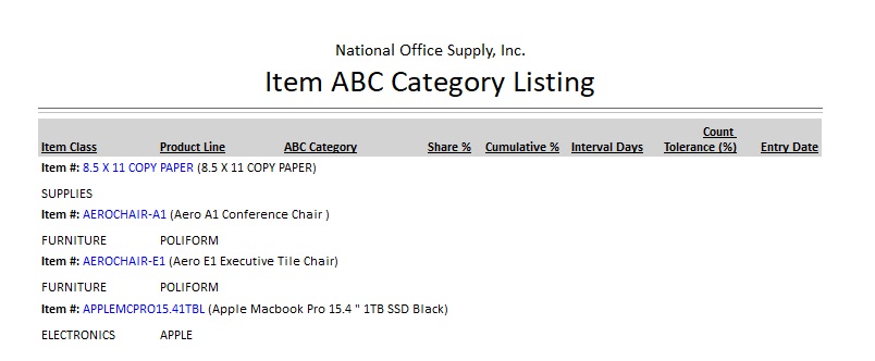 ![]() Item ABC Category Listing The Item ABC Category Listing shows information on the ABC category assigned to each item. The report is useful for reviewing and monitoring the correctness of the ABC category assignment of each inventory item. It can also be used as reference if you want to update the item counted quantities by ABC category. You can generate the report to show only inventory items with active status, only items assigned with inactive status or all items.