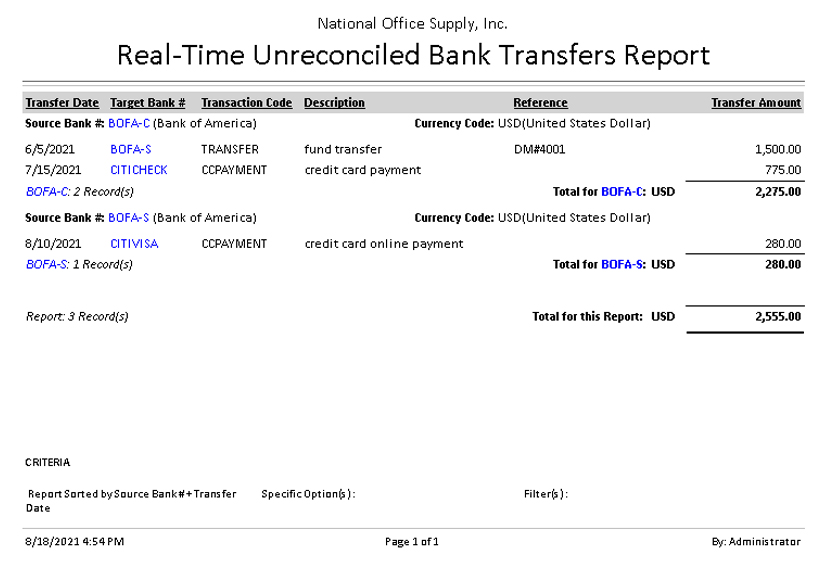 ![]() Real-Time Reconciled Bank Transfers Report The Real-Time Reconciled Bank Transfers Report provides detailed information on all bank transfer transactions marked in AccountMate as having cleared the bank. The report displays all the reconciled bank transfers in the system regardless of the date the report was generated. The report includes information such as source bank #, target bank #, transfer date, currency, transfer amount and the date it was marked as reconciled. The report is useful for verifying that reconciled bank transfers are authorized and can be used as reference in reconciling bank transfer transactions. You can generate this report for an individual source bank account. You can also opt to generate this report either for all or a range of source bank account, all or a range of target bank accounts, and all or a range of transaction codes. You can further filter the report by specifying the transfer date or the reconciled date, and either to show or not to show matching imported bank transfer transactions.